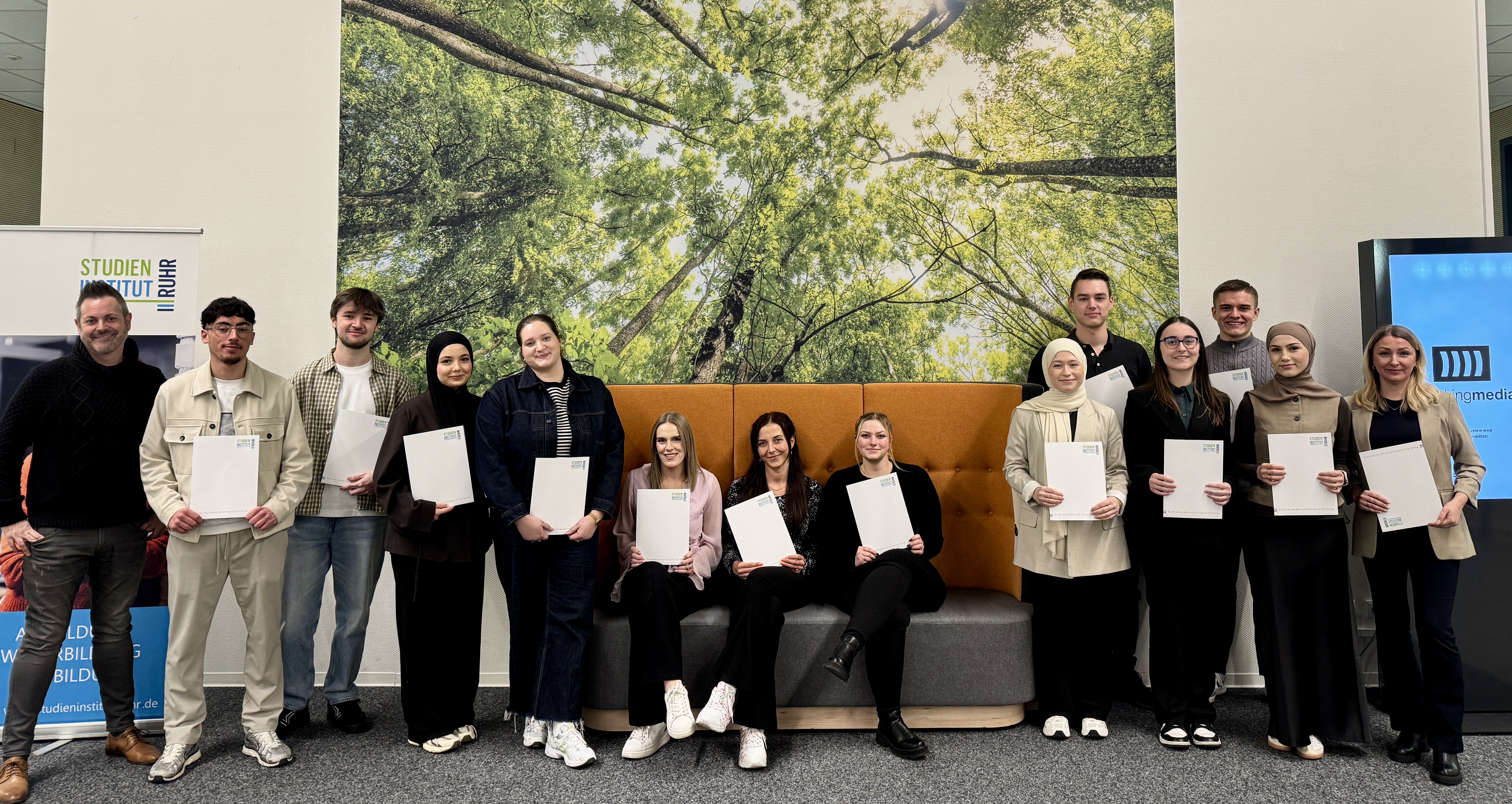 In den letzten zwei Tagen wurde es spannend am Studieninstitut Ruhr: Die Abschlussprüfungen für die Vorzieher des Lehrgangs VFA (Verwaltungsfachangestellte) standen an – und sie endeten feierlich mit der Zeugnisübergabe. Bei den Vorziehern handelt es sich um Auszubildende mit besonders guten Leistungen, die ihre Ausbildung verkürzt haben. Umso schöner: Alle haben bestanden. Darauf sind wir sehr stolz! Die Absolventinnen und Absolventen kamen aus den Städten Bochum, Witten, Herne und Lünen.